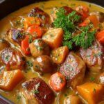 Le parfum envoûtant des marrons rôtis se mêle à la douceur du potiron dans cette blanquette de dinde, créant une harmonie parfaite de saveurs. Chaque bouchée est comme un câlin réconfortant, à la fois crémeux et savoureux, qui évoque les belles tablées familiales.