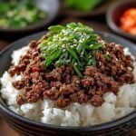 Servez le boeuf haché coréen sur du riz vapeur, garni d’oignons verts ciselés et de graines de sésame pour une touche finale.