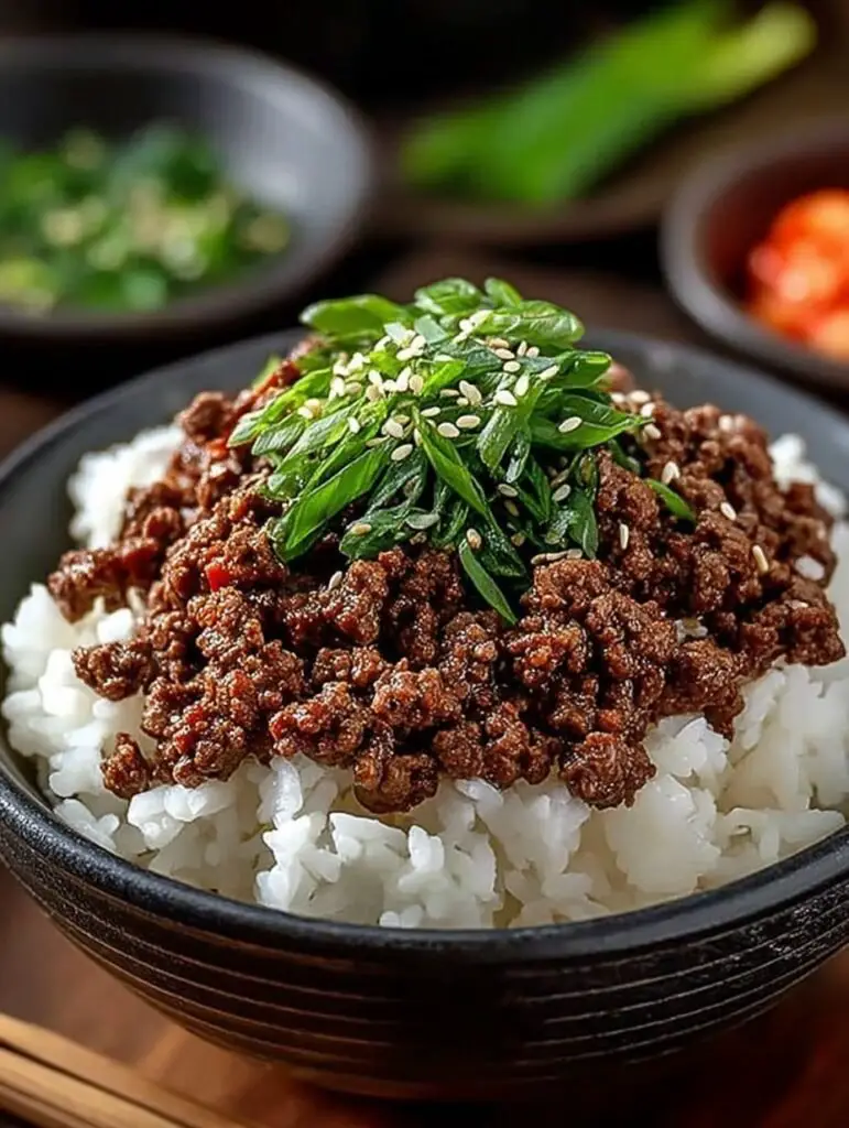 Servez le boeuf haché coréen sur du riz vapeur, garni d’oignons verts ciselés et de graines de sésame pour une touche finale.