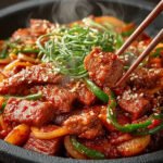 Délicieuse recette de bulgogi de porc épicé coréen avec des instructions détaillées et des informations nutritionnelles.