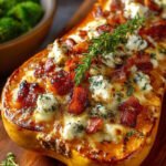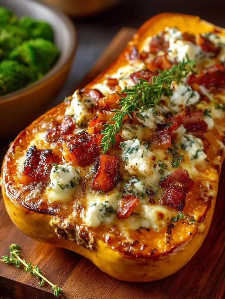 Dressez vos Butternut Farcie aux Lardons et au Chèvre sur une assiette colorée. Ajoutez quelques herbes fraîches sur le dessus pour une touche décorative. Ce plat se déguste aussi bien chaud que tiède, accompagné d’une salade verte croquante.