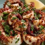 Imaginez un plat de calamars grillés, parfumé à l’ail, croustillant à l’extérieur et tendre à l’intérieur. Le mariage parfait entre la mer et la chaleur du gril, une explosion de saveurs en bouche.