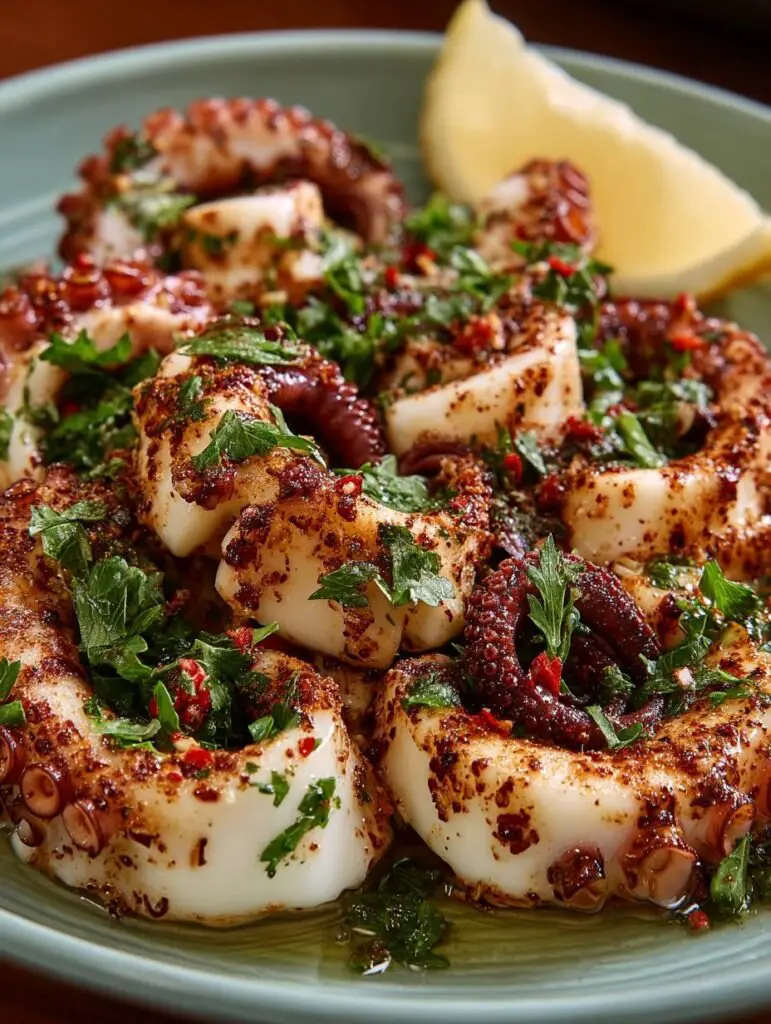 Imaginez un plat de calamars grillés, parfumé à l’ail, croustillant à l’extérieur et tendre à l’intérieur. Le mariage parfait entre la mer et la chaleur du gril, une explosion de saveurs en bouche.