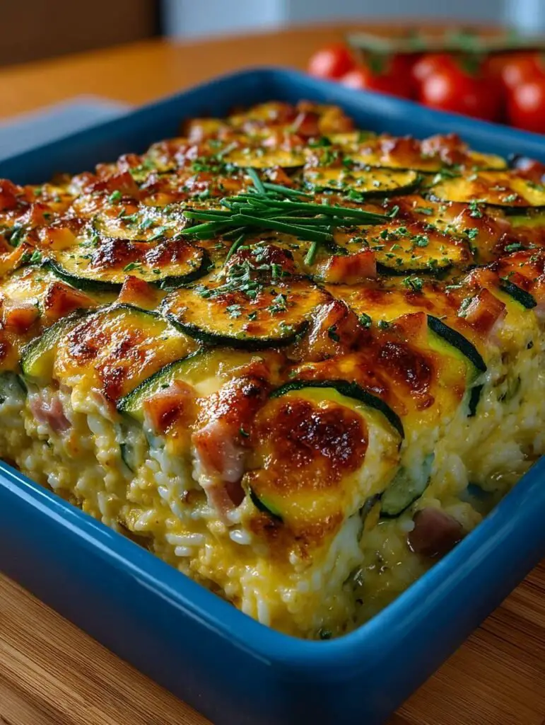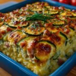 Les courgettes dorées au four, le riz crémeux et le jambon tendre se combinent pour créer un plat irrésistible qui fait vibrer les papilles. Imaginez une bouchée chaude, pleine de saveurs réconfortantes, qui évoque des souvenirs de repas familiaux autour de la table.