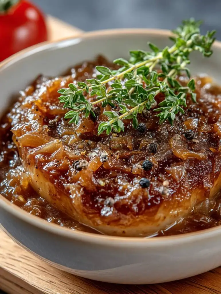 Votre Köstliche Zwiebelsoße selbstgemacht: Perfekt für jedes Gericht! est prête ! Servez-la chaude sur des filets de poulet grillés ou des légumes rôtis pour un plat élégant. Garnissez éventuellement avec quelques herbes fraîches comme du persil ou ciboulette pour une touche colorée.