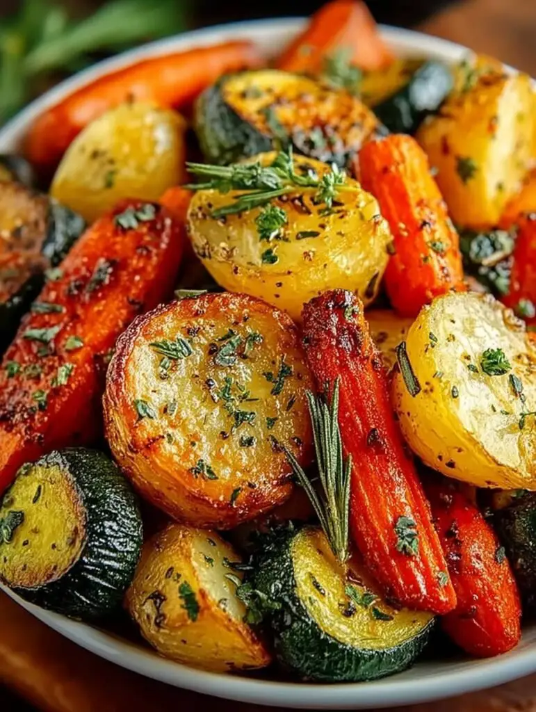 Délicieuse recette de légumes rôtis à l’ail et aux herbes avec des instructions détaillées et des informations nutritionnelles.