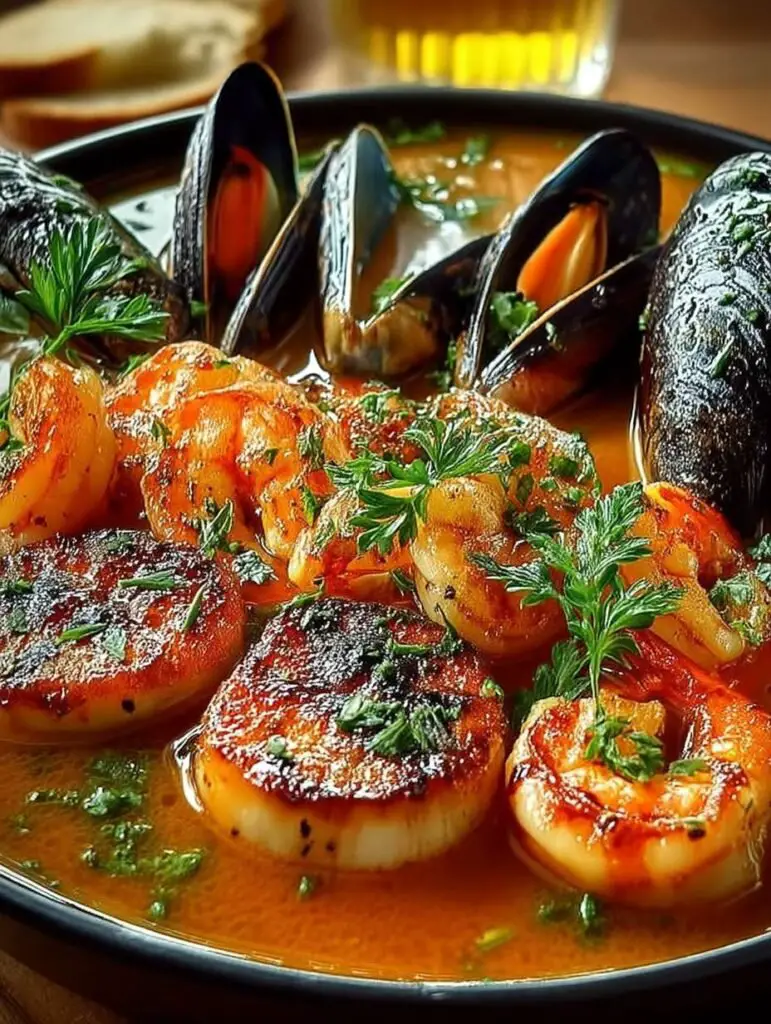 Ajoutez les filets de poisson blanc coupés en morceaux ainsi que les crevettes décortiquées et les moules. Laissez mijoter encore 5-7 minutes jusqu’à ce que tous les fruits de mer soient cuits.