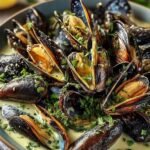 Délicieuse recette de moules à la crème à l’ail avec des instructions détaillées et des informations nutritionnelles.