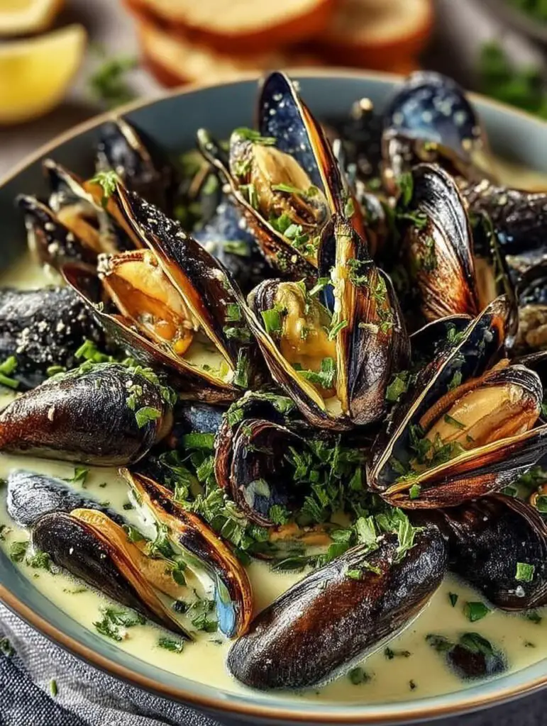 Délicieuse recette de moules à la crème à l’ail avec des instructions détaillées et des informations nutritionnelles.