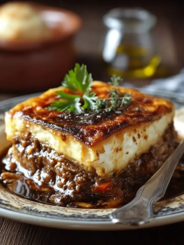 Délicieuse recette de moussaka grecque : un festin méditerranéen avec des instructions détaillées et des informations nutritionnelles.