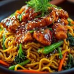 Préparer des Nouilles Sautées au Poulet Caramélisé est un jeu d’enfant. En quelques étapes simples, vous obtiendrez un plat délicieux qui impressionnera vos invités. La combinaison de saveurs sucrées et salées offre un profil gustatif unique. Visuellement, ces nouilles brillent de mille feux avec leur sauce dorée, rendant le plat irrésistible. De plus, cette recette est incroyablement polyvalente : personnalisez-la avec vos légumes préférés ou remplacez le poulet par du bœuf ou de la dinde.