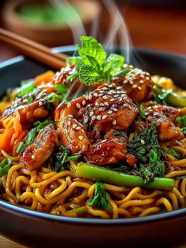 Les Nouilles Sautées au Poulet Caramélisé vous promettent une explosion de saveurs à chaque bouchée, avec des morceaux de poulet juteux et des nouilles parfaitement enrobées d’une sauce sucrée-salée. Imaginez la texture légèrement croustillante des légumes croquants qui accompagnent le tout, créant un équilibre parfait.