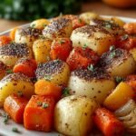 Imaginez une assiette remplie de légumes rôtis dorés, avec des oignons caramélisés, des carottes sucrées et des pommes de terre croustillantes. Chaque bouchée vous transporte dans un monde de saveurs réconfortantes, évoquant les repas familiaux autour d’une table en bois.