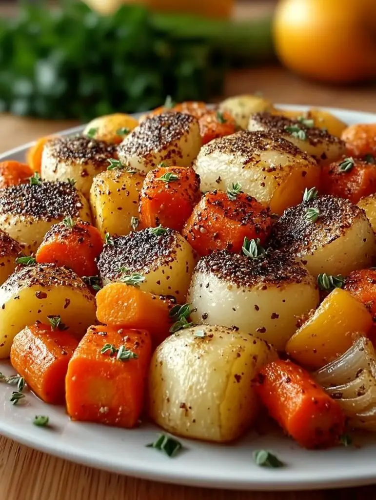 Imaginez une assiette remplie de légumes rôtis dorés, avec des oignons caramélisés, des carottes sucrées et des pommes de terre croustillantes. Chaque bouchée vous transporte dans un monde de saveurs réconfortantes, évoquant les repas familiaux autour d’une table en bois.