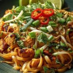 Délicieuse recette de pad thaï au poulet facile et rapide avec des instructions détaillées et des informations nutritionnelles.