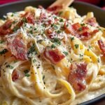 Imaginez des pâtes parfaitement cuites, enrobées d’une sauce crémeuse au parmesan et agrémentées de morceaux de bacon croustillants. Chaque bouchée vous transporte dans un tourbillon de saveurs riches et réconfortantes. C’est un plat qui allie simplicité et délice, idéal pour une soirée entre amis ou un repas en famille.