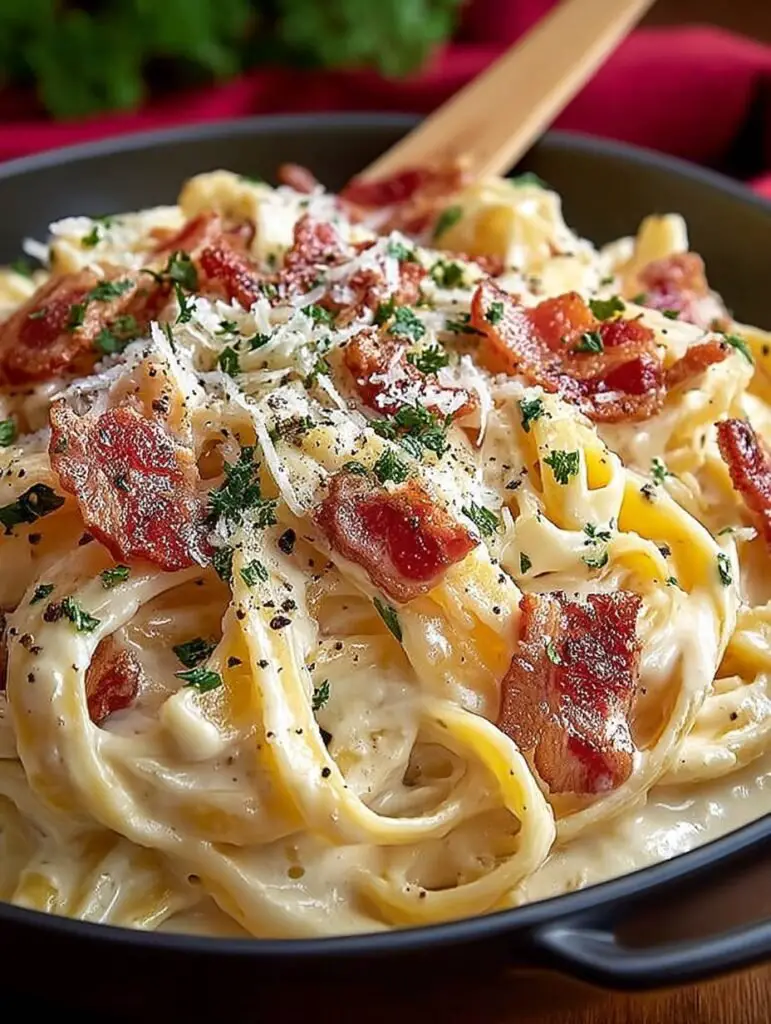 Imaginez des pâtes parfaitement cuites, enrobées d’une sauce crémeuse au parmesan et agrémentées de morceaux de bacon croustillants. Chaque bouchée vous transporte dans un tourbillon de saveurs riches et réconfortantes. C’est un plat qui allie simplicité et délice, idéal pour une soirée entre amis ou un repas en famille.