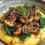 Servez la polenta garnie de champignons sautés et d’épinards frais pour une présentation colorée et appétissante.