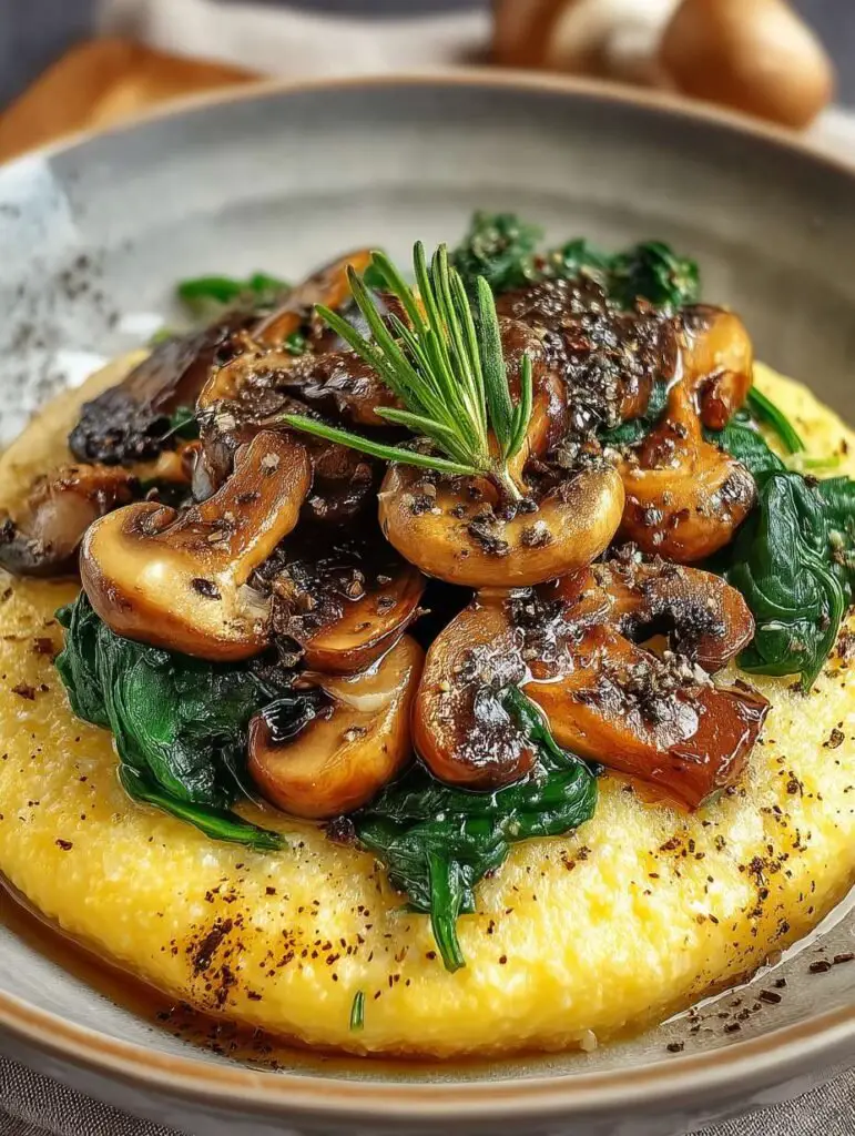 Servez la polenta garnie de champignons sautés et d’épinards frais pour une présentation colorée et appétissante.
