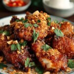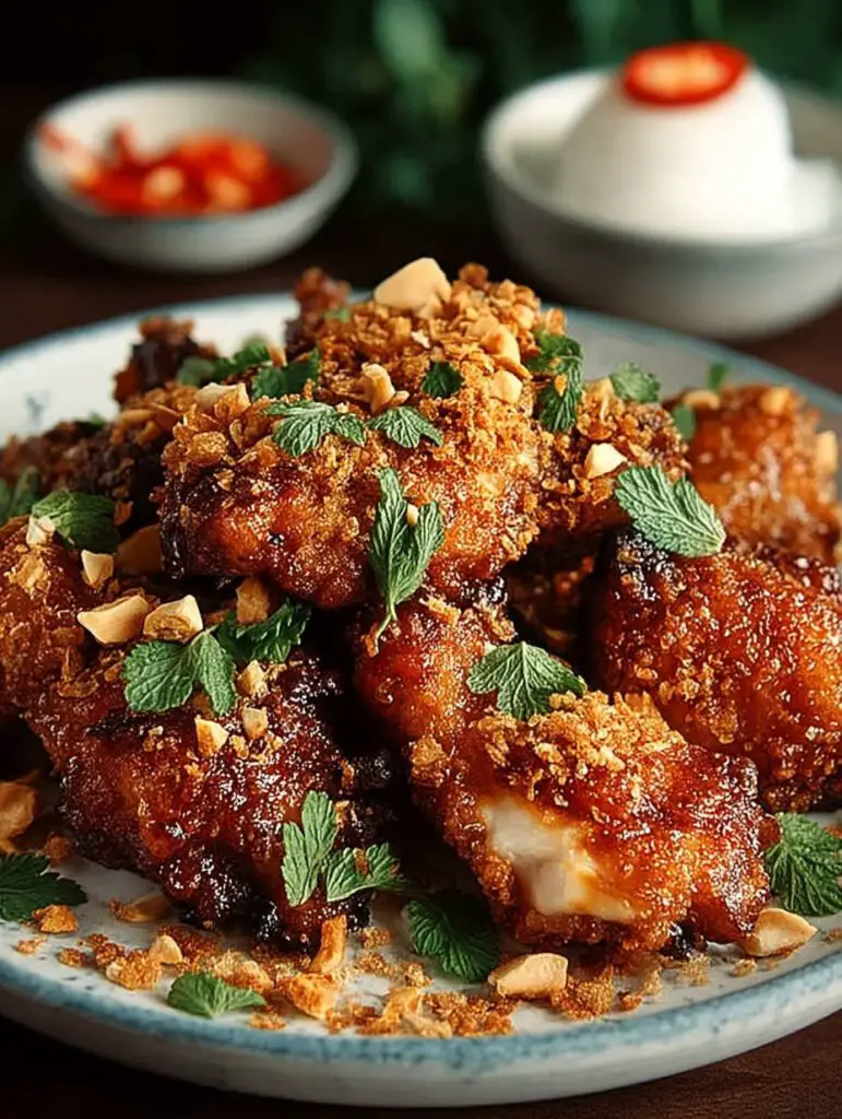 - Disposez le poulet croustillant sur un plat élégant. Garnissez-le avec des feuilles fraîches de coriandre et servez-le avec une sauce aigre-douce.