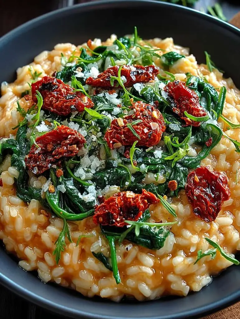 Délicieuse recette de risotto aux tomates séchées et aux épinards avec des instructions détaillées et des informations nutritionnelles.
