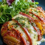 Délicieuse recette de rôti de pommes de terre au jambon et fromage fondu avec des instructions détaillées et des informations nutritionnelles.