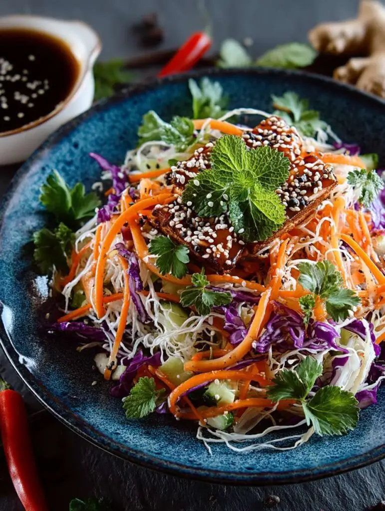 Cette salade chinoise est non seulement délicieuse mais aussi saine et pleine de couleurs vibrantes qui mettent l’eau à la bouche. Parfaite comme entrée ou accompagnement lors d’un repas entre amis ou en famille ! N’hésitez pas à ajuster les ingrédients selon vos goûts ou à y ajouter des protéines comme du poulet rôti coupé en dés pour un plat plus complet ! Bon appétit !