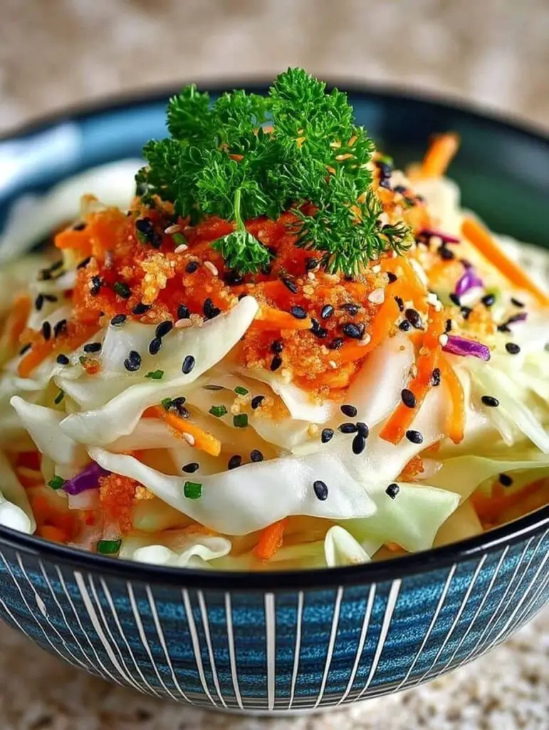 Servez votre Salade de Chou Blanc à la Japonaise dans un joli plat coloré pour mettre en valeur ses teintes vibrantes. Ajoutez quelques feuilles vertes comme décor ou même quelques tranches d’avocat pour encore plus d’élégance.
