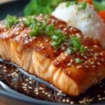 Délicieuse recette de saumon teriyaki au air fryer avec des instructions détaillées et des informations nutritionnelles.