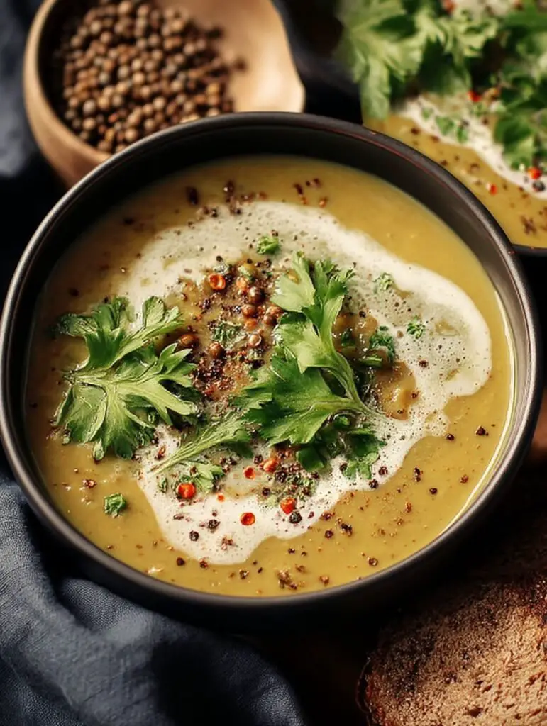Délicieuse recette de soupe de lentilles, lait de coco et épices avec des instructions détaillées et des informations nutritionnelles.