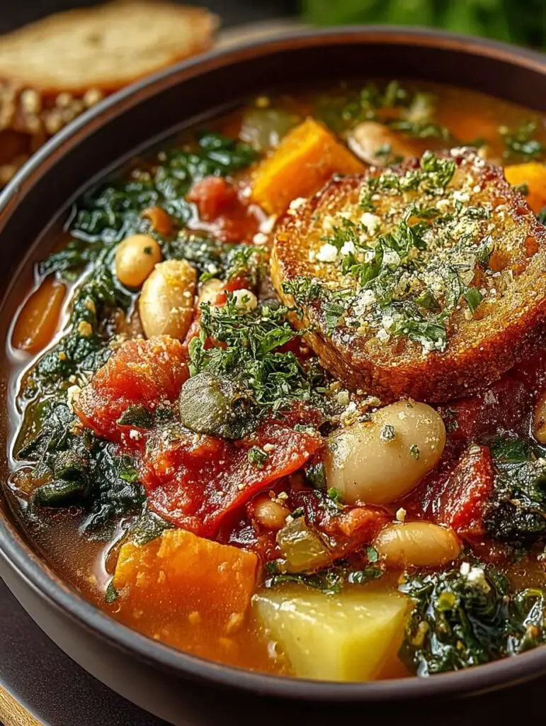 Délicieuse recette de soupe ribollita copieuse avec des instructions détaillées et des informations nutritionnelles.