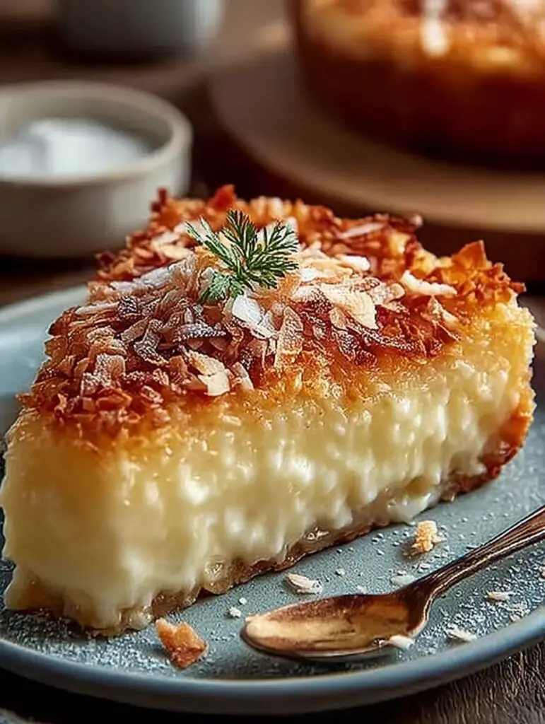 Laissez refroidir avant de démouler délicatement votre Tarte à la Noix de Coco Sans Croûte. Servez-la tiède ou froide, garnie éventuellement d’un peu de crème fouettée ou quelques fruits frais pour une touche colorée.