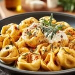 Servez les tortellini crémeux garnis de parmesan fraîchement râpé et d’herbes fraîches pour une touche finale savoureuse.